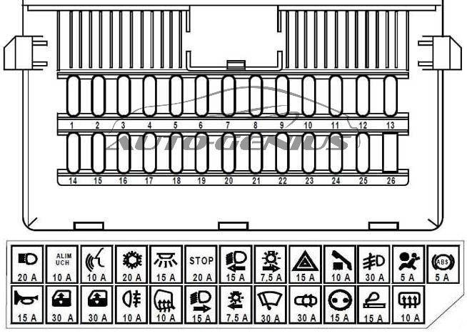 | F11 | 30 | Voice synthesiser – Instrument panel – Front fog lights -Tailgate electric lock – Air conditioning |