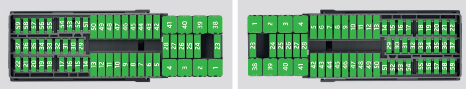 | 30 | Power windows, light switches, reverse light switches, control unit for air conditioning system, control unit for park assist, exterior mirror, power feed for center button strip, power feed for side button strip, interior mirror |