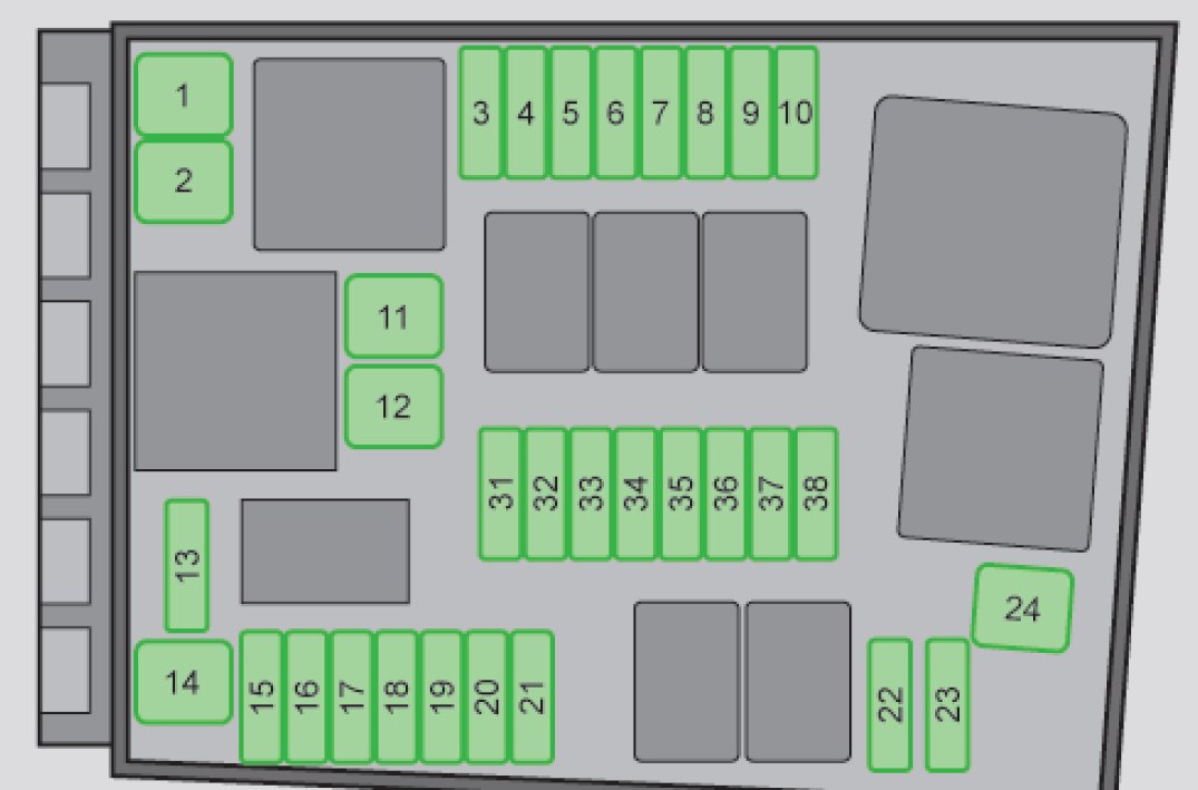 | 34 | TCS button, ESC, tyre control display, pressure sensor for air-conditioning, reverse light switch, dimming rear view mirror, START-STOP button, telephone preinstallation, control for heating of rear seats, sensor for air-conditioning, 230 V power socket, sound actuator |