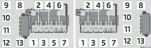 | 9 | Operating controls for the heating, electronic control unit for air conditioning system, park distance control, window lift, engine cooling fan, washing nozzles |