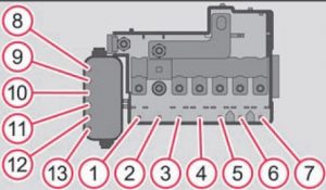 | 9 | Operating controls for the heating, control unit for air conditioning system, parking aid, control unit for cornering lights, coolant fan |