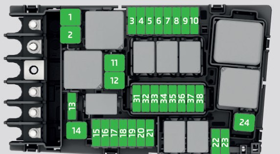 | 34 | TCS, ESC button, tyre pressure monitor, pressure sensor for air conditioning, reversing light switch, mirror with automatic dimming, START-STOP button, controls for heating the rear seats, sensor for air conditioning, parking brake, light switch |