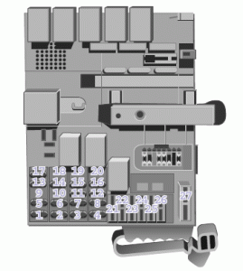 | 16 | Remote locking actuator motors, safety unit, clock, horn, lower interior light (switch), remote tailgate unlocking | 15 | Blue |