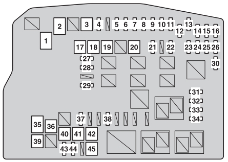 | 23 | ECU-IG NO.1 | 7,5 | Electric cooling fan, AFS, charging system, ABS, VSC |