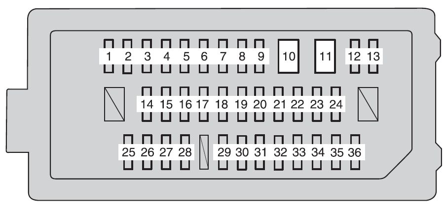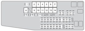 | 35 | ECU-IG1 NO.1 | 10 | Vehicle stability control system, electric cooling fans, steering sensor, multiport fuel injection system/sequential multiport fuel injection system, charging system, rear window defogger, outside rear view mirror defoggers, rain-sensing windshield wipers, Blind Spot Monitor, rear sunshade, dynamic radar cruise control, multiplex communication system, rear seat heater, backup lights, fog lights, headlight (high beam), daytime running light, precollision system |