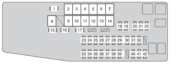 | 42 | ECU-B NO.1 | 10 | Smart key system, gauge and meters, steering sensor, air conditioning system, outside rear view mirror, front power seats, multiplex communication system, starter system |