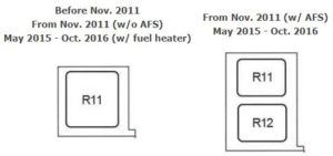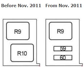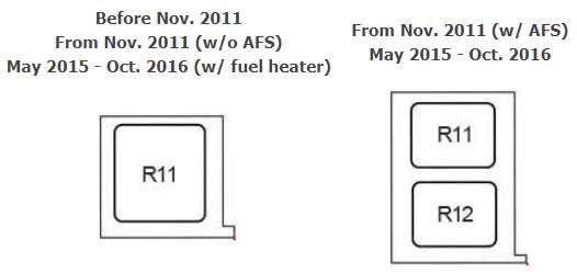 | R11 | Before Nov. 2011: Dimmer From Nov. 2011: without AFS: Dimmer From Nov. 2011: with AFS: – May 2015 – Oct. 2016: with fuel heater: Fuel Heater (FUEL HTR) without fuel heater: – |